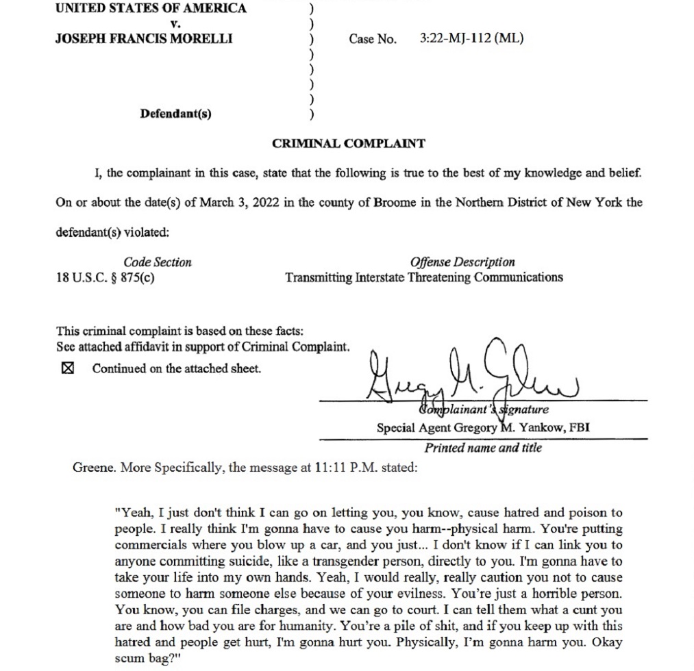 UPDATE August 24, 2023; SYRACUSE, NEW YORK – Joseph F. Morelli, age 51, of Endicott, New York was sentenced today to serve three months in Federal prison for making threatening phone calls from his home to the voicemail in the office of a member of Congress in Washington, D.C. United States Attorney Carla B. Freedman and Alfred Watson, Acting Special Agent in Charge of the Albany Field Office of the Federal Bureau of Investigation (FBI), made the announcement. Morelli was ordered to surrender to prison on October 2, 2023. Chief U.S. District Judge Brenda K. Sannes also ordered Morelli to serve a three-year term of supervised release after completing his sentence of incarceration. The Court directed the parties to further brief the issue of restitution sought by the victim for a decision at a later date. According to an affidavit U.S. Attorney's Office, Northern District of New York, Morelli left seven threatening messages at Taylor Greene's DC congressional office on March 3 and March 4 of last year. In one, Morelli allegedly identified himself and provided his phone number. He then said: "You've got a big fucking mouth, and I'm gonna show you what violence is really about." In a recording, the man who said he was Morelli sated he could "pay someone 500 bucks to take a baseball bat and crack your skull." He added: "You are going to get fucking physically hurt."