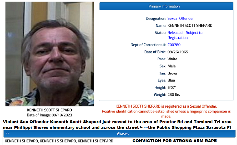 in State prison in Florida. Violent sex offender Kenneth Scott Shepard white male, 5' 7" tall and 230 lbs, DOB 9/26/1965 he is 58 years old and living outdoors near Phillippi Shores elementary school in Sarasota Fl.